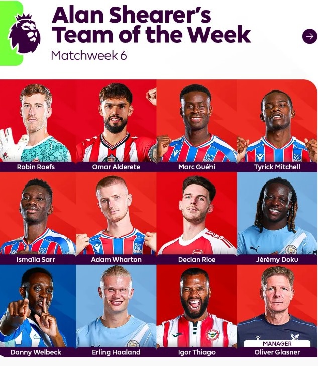 9月30日讯 英超第6轮战罢,名宿阿兰-希勒也评比出本轮最好阵,其中 哈兰德、赖斯等在列,具体如下: