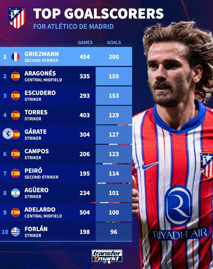 马竞队史弓手榜:格列兹曼200球居首,托雷斯、阿圭罗在列