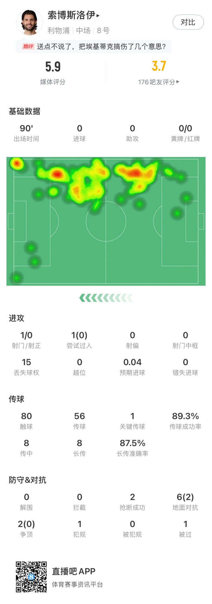 本场比赛索博斯洛伊1次射门无射正,1次过东谈主未生效,56次传球1次要道传球,传球生遵循89.3%,6次大地反抗2次生效,2次争顶无生效。