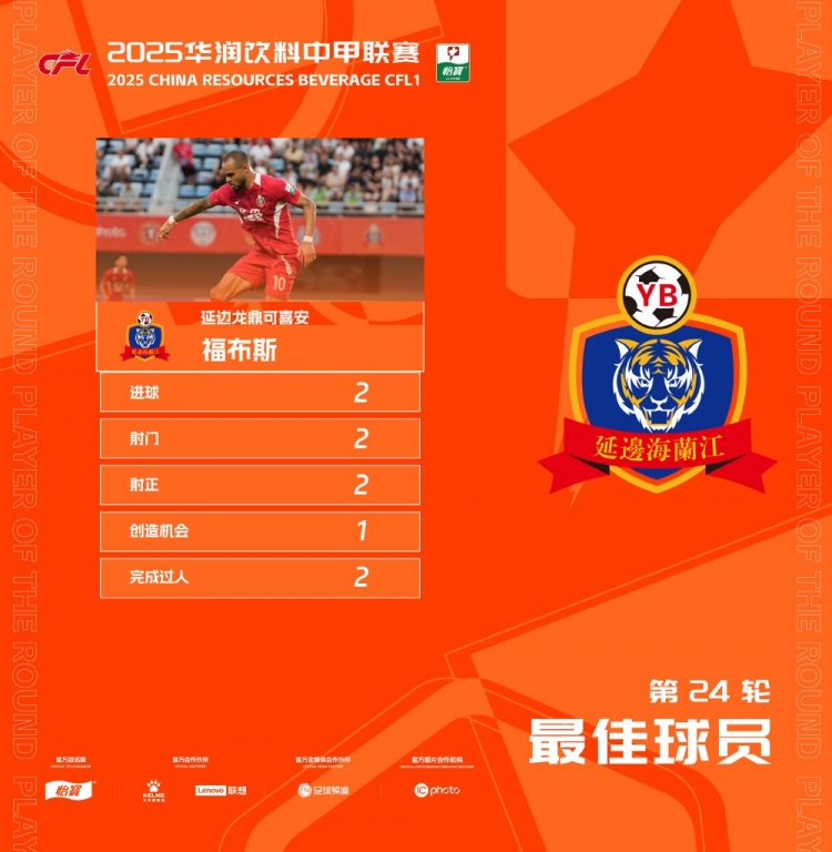 官方:梅开二度助延边轻取铜梁龙,福布斯当选中甲第24轮最好球员