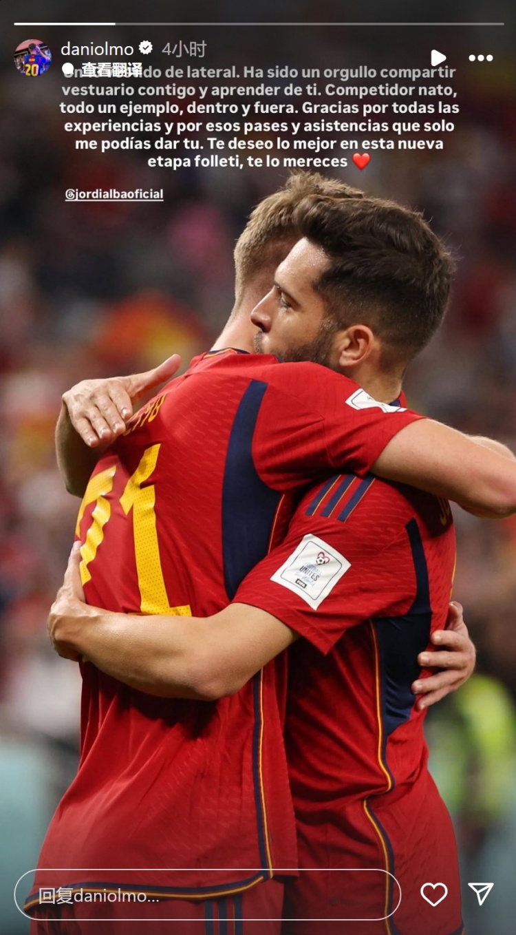 奥尔莫社媒晒出与阿尔巴在西班牙队的合照,配文:“一位10号边后卫。能与你共用更衣室并向你学习,我深感走时。天生的竞争者,场上场下王人是楷模。”