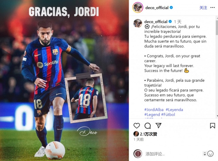 德科社媒晒出感谢阿尔巴的海报,配文:“恭喜,约迪,你渡过了精彩的办事生计。你的‘足球遗产’将永存,祝昔时获得成功!”
