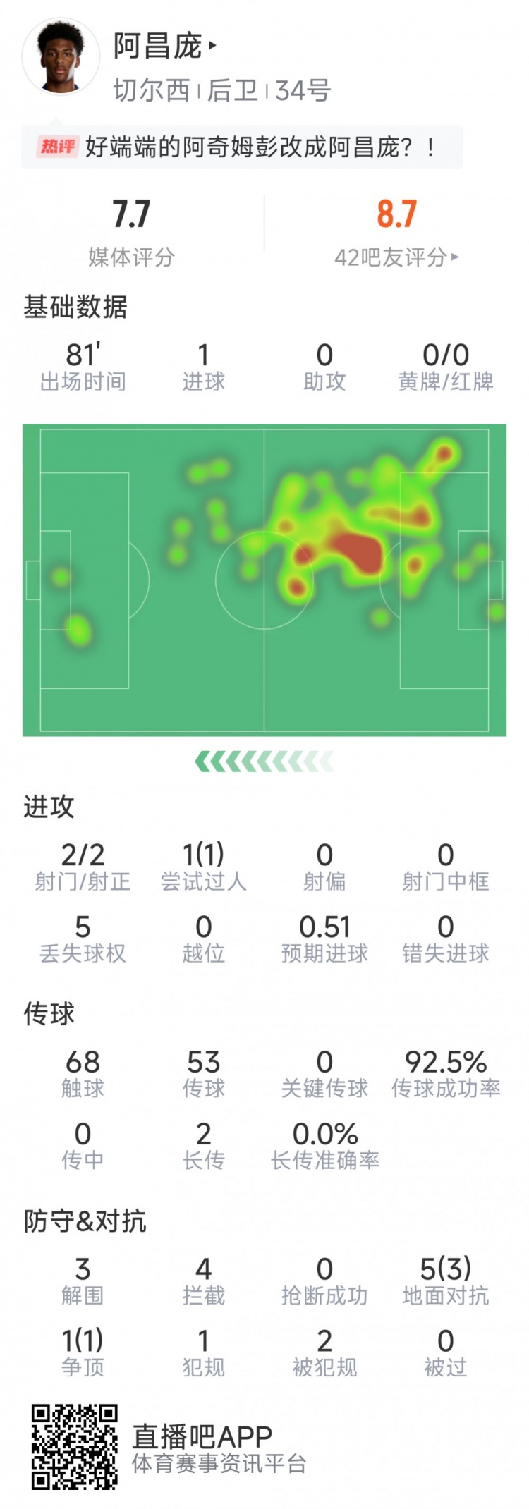 阿昌庞本场数据:打进蓝军处子球,2射2正,3次突围,4次阻扰