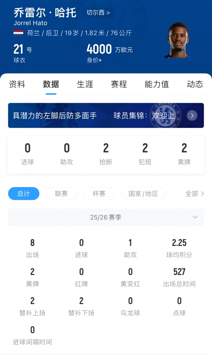 本赛季,哈托更多是当作交替球员,本赛季于今为切尔西出场8次,孝顺1次助攻,他觉得出场527分钟。他当今的德回身价为4000万欧。