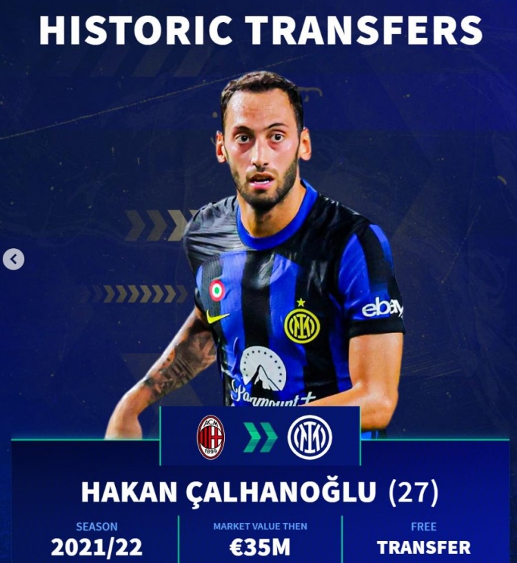 恰尔汗奥卢(米兰→国米),27岁,21-22赛季,身价3500万,目田身转会