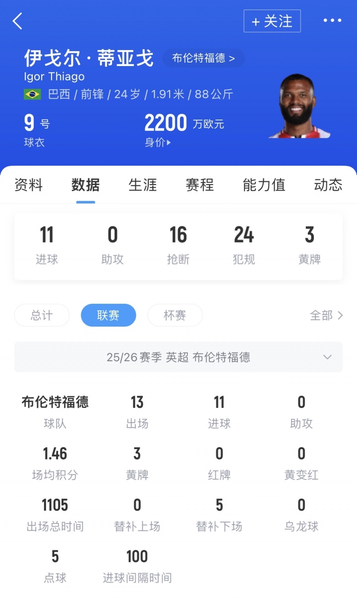11月30日讯 英超第13轮,布伦特福德主场3-1打败伯恩利,伊戈尔·蒂亚戈梅开二度,本赛季英超13轮11球,在弓手榜上仅次于哈兰德(14球),各项赛事14场12球进账。
