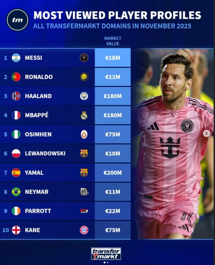 12月3日讯 德转列出了11月份球员页面浏览量排行,前三治安为梅西、C罗、哈兰德。