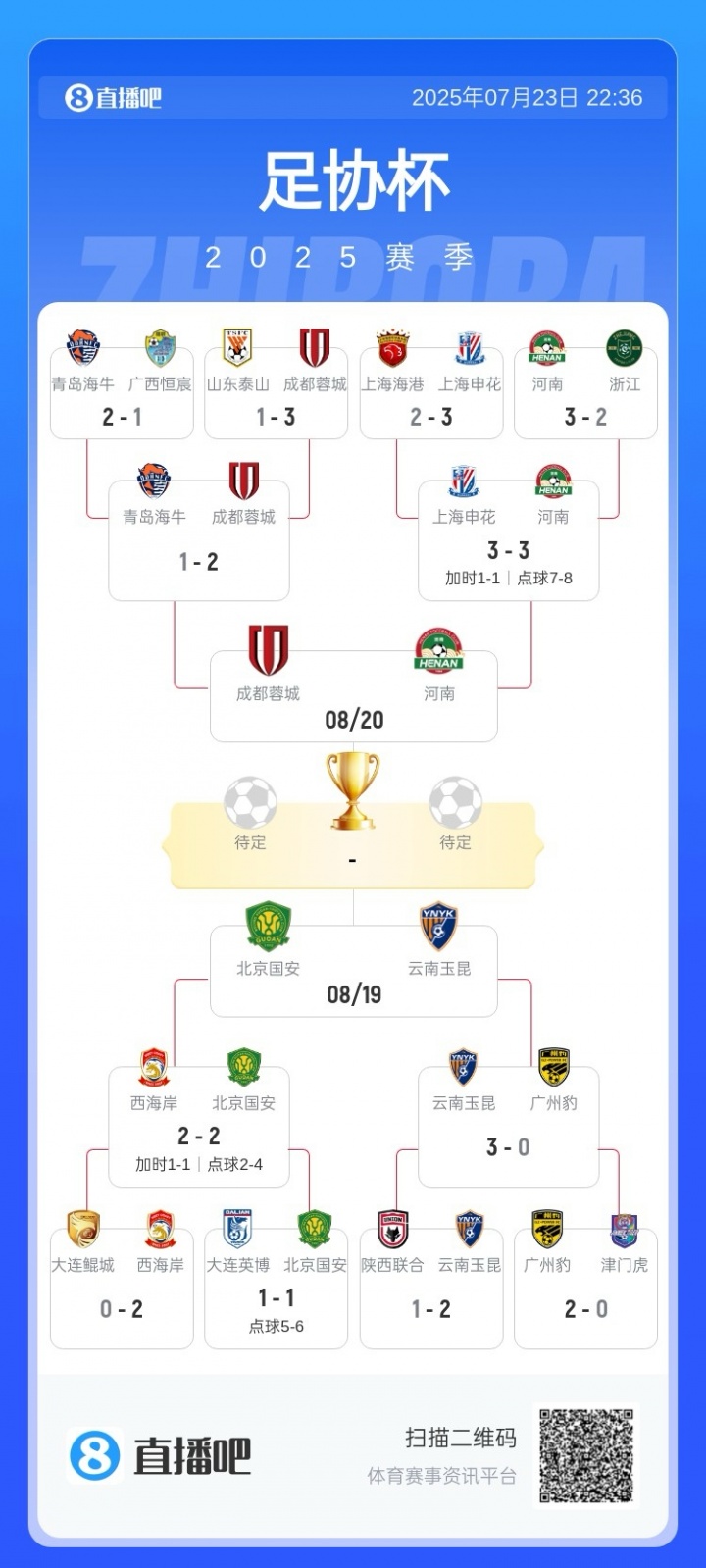 昨天的两场1/4决赛,北京国安点球大战驯服青岛西海岸,云南玉昆3-0打败广东广州豹,国安将与玉昆相遇。