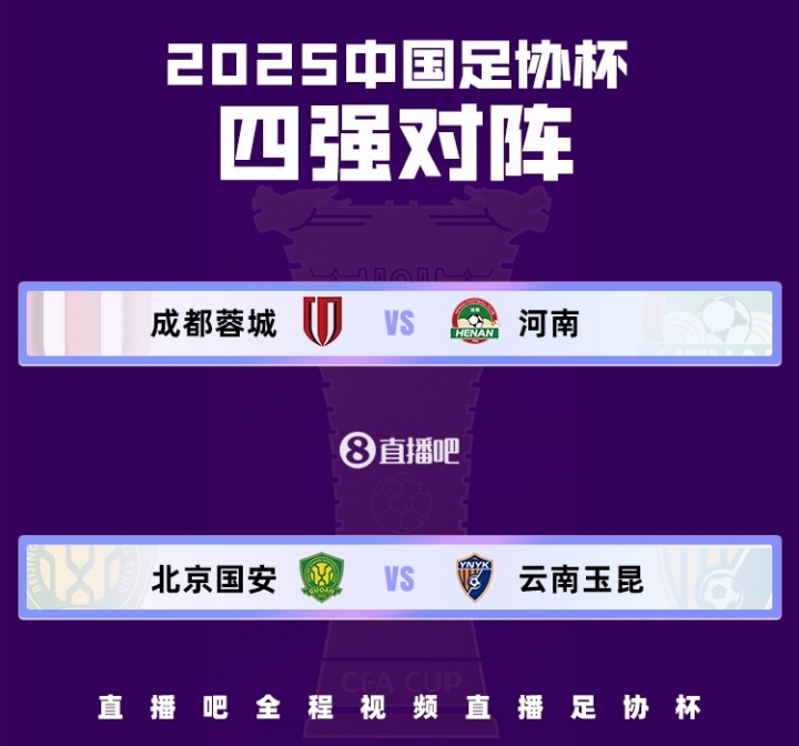 足协杯半决赛对阵出炉:北京国安vs云南玉昆,成齐蓉城vs河南