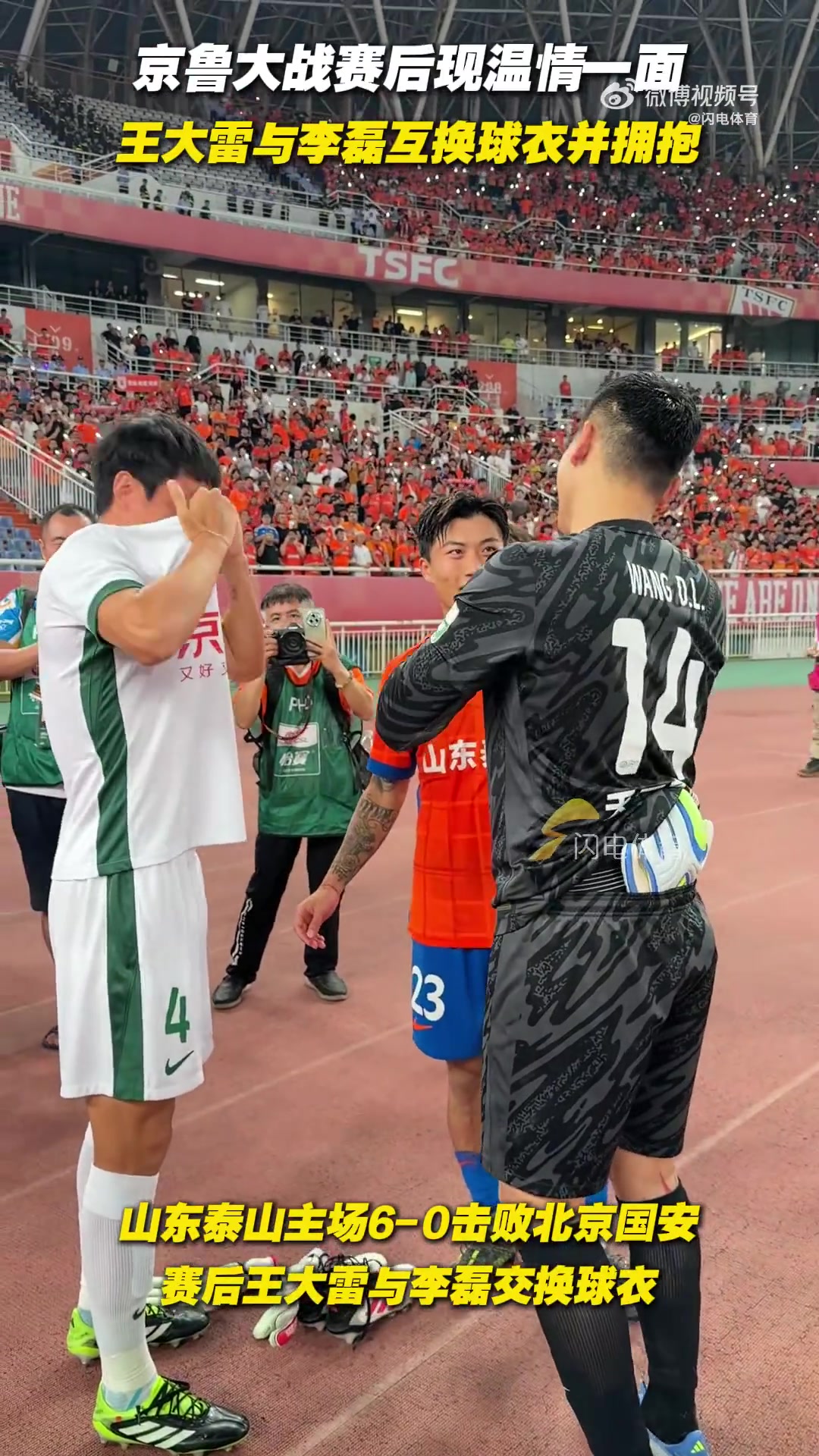 今晚中超第23轮的京鲁大战,泰山主场6-0大捷国安。赛后,李磊和王大雷在场边相互拥抱并交换了球衣。