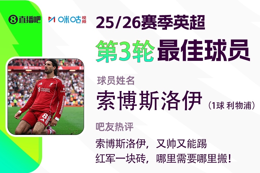 25-2026赛季英超火热进行中,和咪咕体育集合发起每轮英超最好球员评比活动!第三轮评比成果结出炉,利物浦中场索博斯洛伊攻入一粒超极随性球寰宇波,匡助利物浦三连胜登顶!他得到吧友十几万吧友的投票赞成,以较大上风当选 【X咪咕体育英超第3轮最好球员】!