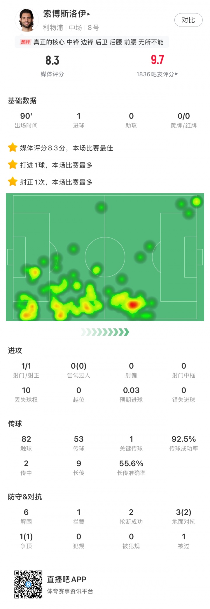 利物浦1-0阿森纳,索博斯洛伊1粒超极随性球!