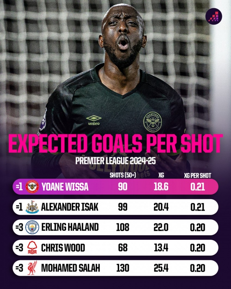 上赛季英超每次射门预期进球数榜单:维萨与伊萨克0.21并排第1