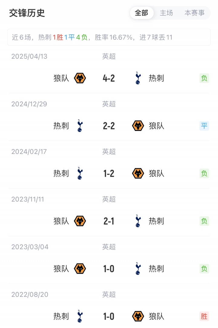 热刺杀手?热刺与狼队交手已聚合6场不堪,狼队5连败后送其首分