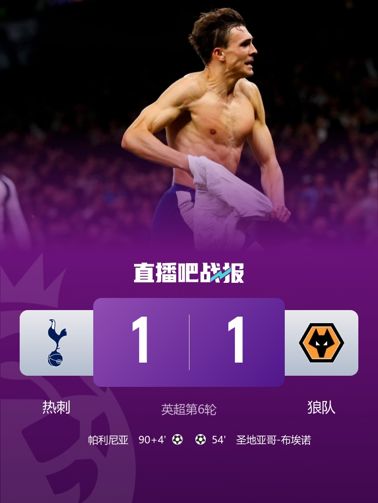 09月28日讯 英超第6轮,热刺补时阶段惊现扳平狼队,当今热刺与狼队交手已聚合6场不堪,况且在狼队5连败后送其本赛季首个积分。