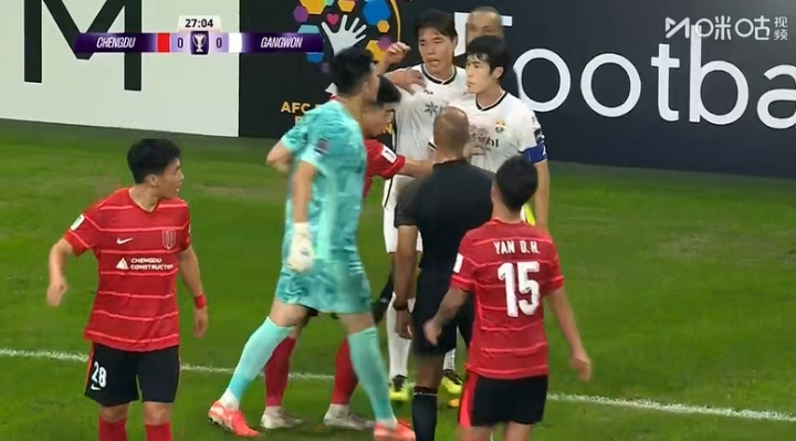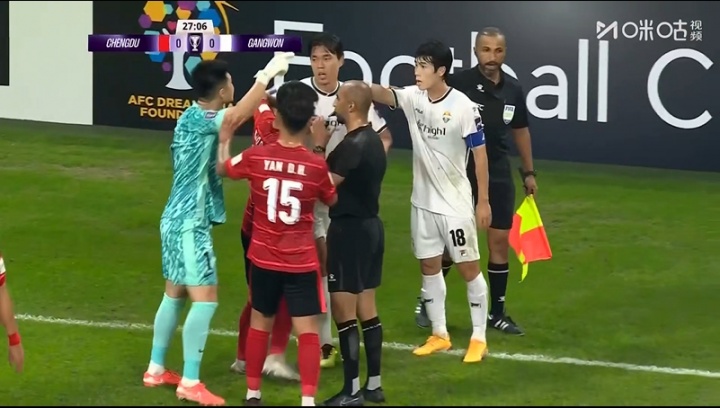 09月30日讯 蓉城vs江原第27分钟,古尔芬克尔突围后遭江原球员金谈现“掏裆”,前者晦气倒地,两边也就此产生小规模结巴。
