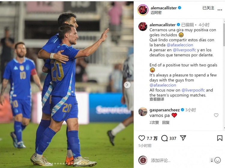 麦卡利斯特社媒晒出比赛像片,并写谈:“以两粒进球范畴了积极的海外比赛日之旅,与国度队伙伴们共度数日时光老是令东谈主感到快意。”