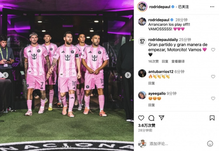 10月25日讯 好意思职联季后赛1/8决赛,迈阿密国外主场3比1打败纳什维尔。赛前,德保罗更新社媒庆祝球队见效。