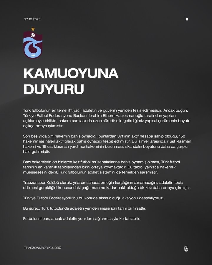 10月27日讯 土超特拉布宗俱乐部发表公开声明,回答土耳其足协主席哈奇奥斯马诺格鲁所揭露的裁判界“结构性陈腐”问题。