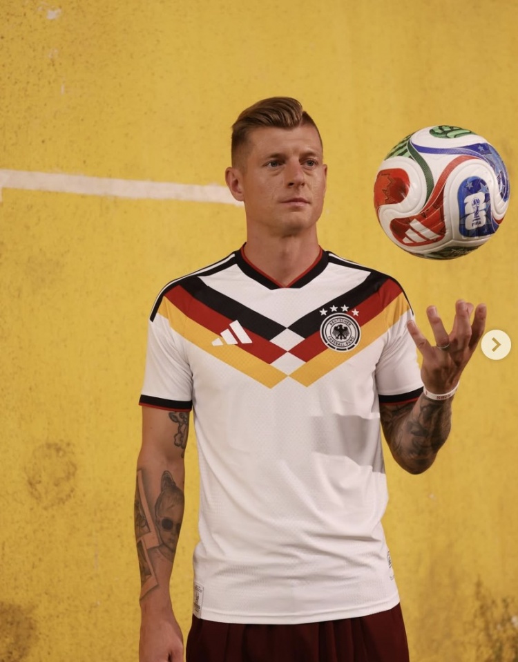 克罗斯为德国队宇宙杯版阿迪达斯战袍宣传预热,并玩笑:别顾忌啦,我不会再(在赛场上)穿这件球衣了,天然似乎看起来这球衣几乎像是在申请我穿上它。不外话说讲究,短裤也很可以。