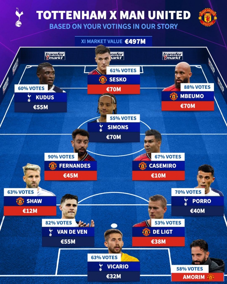 11月8日讯 北京时辰今天晚上20点30分,热刺将在英超第11轮比赛中主场对阵曼联。德国转会市集把柄眷注者的投票列出热刺+曼联威望,B费、舍什科、西蒙斯、范德芬在列。