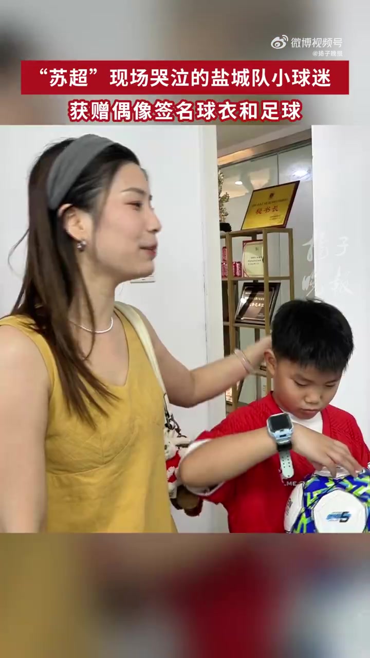 球场抽抽搭噎的盐城小球迷获赠签名球衣和足球,败露激昂笑貌